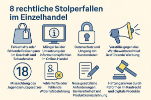 Der Einzelhandel steht rechtlich unter ständigem Veränderungsdruck. Von Preisangaben über Datenschutz bis hin zu neuen Anforderungen in Sachen Barrierefreiheit im Ladengeschäft – wer erfolgreich verkaufen will, muss auch rechtlich auf dem neuesten Stand sein. Die acht behandelten rechtlichen Stolperfallen im Einzelhandel zeigen, wie schnell formale Fehler zu Bußgeldern, Abmahnungen oder Imageverlust führen können.