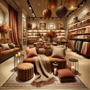 - Kissen und Polster: Gemütliche Sitzmöglichkeiten mit saisonalen Stoffen laden Kunden zum Verweilen ein.