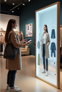 Smart Mirrors – smarte Spiegel, die mit digitalen Funktionen ausgestattet sind – bieten ein besonders innovatives und immersives Erlebnis. Sie ermöglichen es Kunden, Kleidungsstücke virtuell anzuprobieren, ohne sich umziehen zu müssen, oder verschiedene Farbkombinationen und Accessoires mit wenigen Berührungen zu testen. Diese Technologie spart Zeit und sorgt für ein unterhaltsames, modernes Einkaufserlebnis, das sich klar vom Online-Shopping abhebt. Darüber hinaus lassen sich Smart Mirrors mit individuellen Empfehlungen und Cross-Selling-Angeboten verbinden, die auf den bisherigen Interessen und Käufen der Kunden basieren.