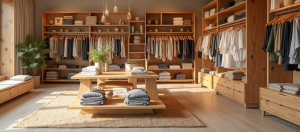 Ein Modegeschäft entschied sich für helle Holzelemente, die sowohl Eleganz als auch eine natürliche Atmosphäre schaffen.