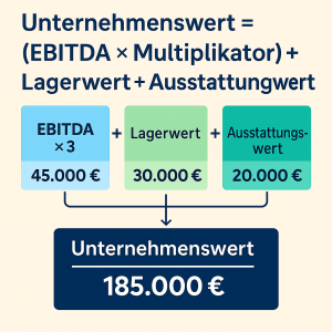 Formel: Unternehmenswert = (EBITDA × Multiplikator) + Lagerwert + Ausstattungswert Unternehmenswert = (45.000 € × 3) + 30.000 € + 20.000 € = 185.000 €